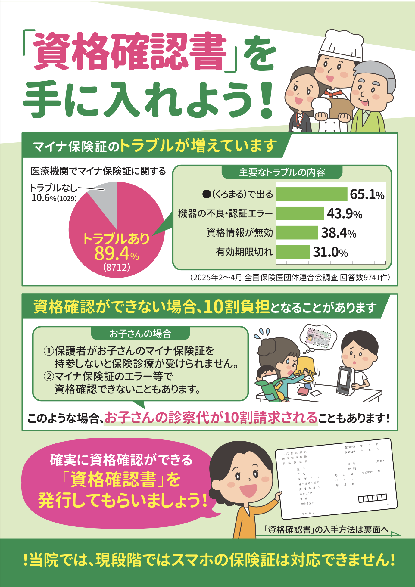 院内の掲示物としてご利用頂ける《資格確認書をお持ちくださいポスター》及びA4版チラシを作成しました。こちらからPDFをダウンロード後、プリントアウトしてご使用ください。 ポスターダウンロード千葉協会版ポスター(HP掲載用) チラシダウンロード資格確認書を手に入れようチラシA4版両面