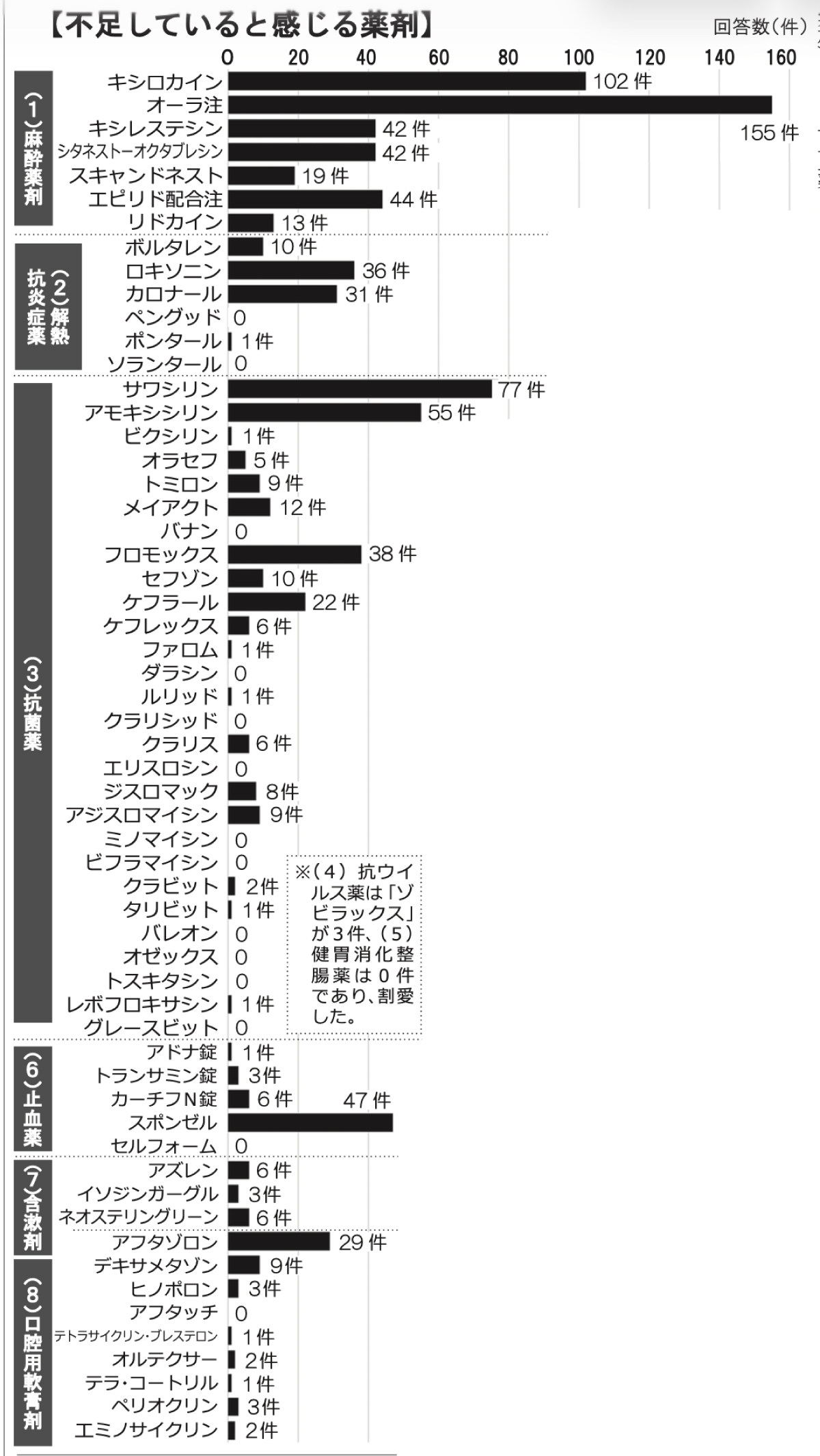 手元に薬の備蓄がないことを反映している可能性がある。不足している薬剤名について、「麻酔薬」は、オーラ注(155件、全体の82・9%)が最も多い回答であった。麻酔薬は、ほとんどの歯科治療・手術で使用され「治療ができない」という声が多く寄せられた。