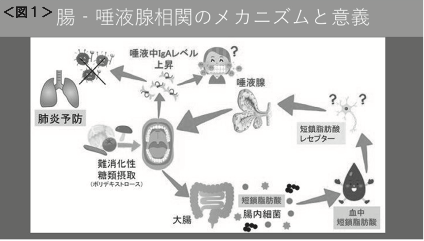 以下、講演の要点を挙げると、① う蝕感受性と唾液IgAは関連がある。② 唾液IgAレベルが高いとう蝕の予防に有用、また気道感染(コロナやインフルエンザなど)の罹患率が減少(コロナ感染と唾液IgAについてご自身のグループの研究を紹介)、③ 難消化性糖類の摂取により大腸の短鎖脂肪酸が増えるとともに唾液IgA濃度や分泌速度が増加する(図1)。