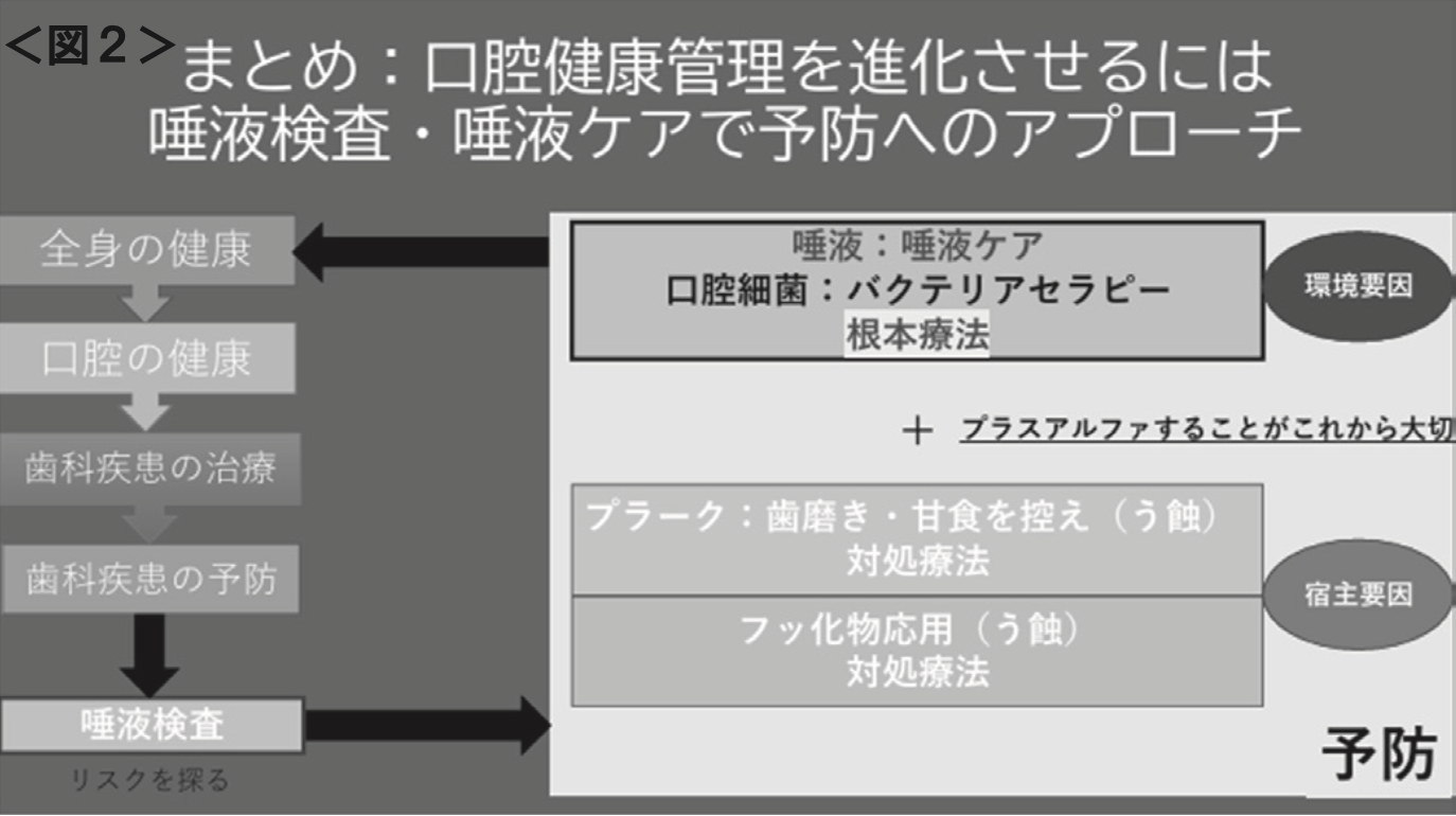また、唾液IgAを増加させる方法としてガム咀嚼や軽い運動が紹介された。さらに、唾液IgAの機能を「口腔清掃度の指標であるアンモニアが低下させることから、その機能を低下させないためには、口腔清掃状態を良好に保つことが重要である」と示された。(口腔健康管理を進化させるには、唾液検査と唾液ケアが重要。図2)