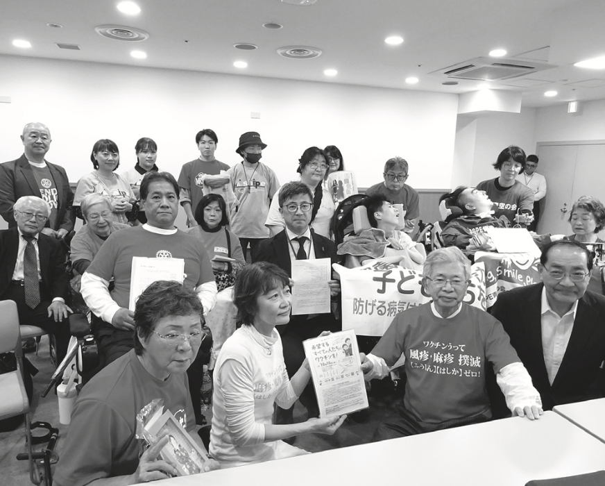 ワクチンパレードを終えた一行は、厚生労働省を訪問。審見学感染症対策部長と面談し、VPD(ワクチンで防げる病気)から子どもを守るための予防接種施策に関する要望書(協会を含む15団体と医師4名が連名)を提出した。要請団体に名を連ねた太田洋いすみ市長が要望書を代表して読み上げた。百日咳の急増、麻疹拡大の兆しなど日本の現状を指摘したうえで、①一生治らない難聴をはじめ重大な合併症のリスクから子どもたちを守るためにおたくふかんぜを早急に予防接種法のA類疾病に定めること、②百日咳感染による乳児死亡を防ぐために成人用三種混合ワクチンの承認および妊婦への接種勧奨、就学前の三種混合および不活化ポリオワクチンの追加接種を定期接種に追加すること、③HPVワクチン接種率向上のため、文科省と連携した児童、生徒、保護者への啓発活動により接種勧奨及び男性を定期接種対象に拡大することの3点を要請項目として、希望するすべての人たちが自治体格差なく、全国どこでも安心して無料でワクチン接種できる体制構築を求めている。要請を受け、鷲見部長は「皆さんの声をしっかりと受け止めました。確認し進めて参りたい」と返答した。