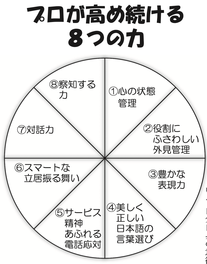 湯佐氏は「安心感を与え、信頼される接客マナーを磨くためには8つの力が必要」とし、図のような接遇マナーを紹介し、今回の講習会では特に「①心の状態管理」について大きく取り上げ解説した。